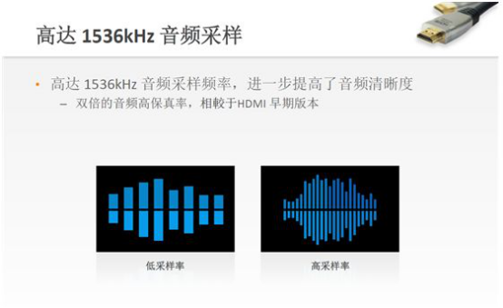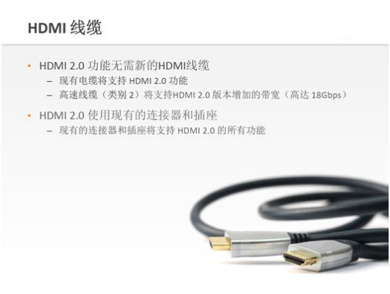 HDMI 2.0的帶寬擴(kuò)充到了18Gbps,支持即插即用和熱插拔,支持3840×2160分辨率和50FPS、60FPS幀率。同時(shí)在音頻方面支持最多32個(gè)聲道,以及最高1536kHz采樣率。HDMI 2.0并沒(méi)有定義新的數(shù)據(jù)線和接頭、接口,因此能保持對(duì)HDMI 1.x的完美向下兼容,現(xiàn)有的二類(lèi)數(shù)據(jù)線可直接使用。HDMI 2.0并不會(huì)取代HDMI 1.x,而是基于后者的增強(qiáng),任何設(shè)備要想支持HDMI2.0必須首先保證對(duì)HDMI 1.x的基礎(chǔ)性支持。