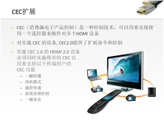 HDMI 1.0版本支持從DVD到藍(lán)光格式的視頻流,而且具備CEC功能,也就是在應(yīng)用中,可以在所有連接設(shè)備間形成一種共通的聯(lián)絡(luò),對(duì)設(shè)備組具備更方便的控制。