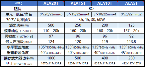 柱陣列揚(yáng)聲器是ALA的最大特色。ALA系列采用3英寸口徑揚(yáng)聲器,和22毫米口徑球頂高音。3寸單元垂直緊密排列,對(duì)應(yīng)4個(gè)型號(hào),分別使用了5、10、15、20只單元。高音單元同樣以垂直緊密排列的方式安裝在音箱中部,以2、4、4、6只的數(shù)量對(duì)應(yīng)4個(gè)型號(hào)。